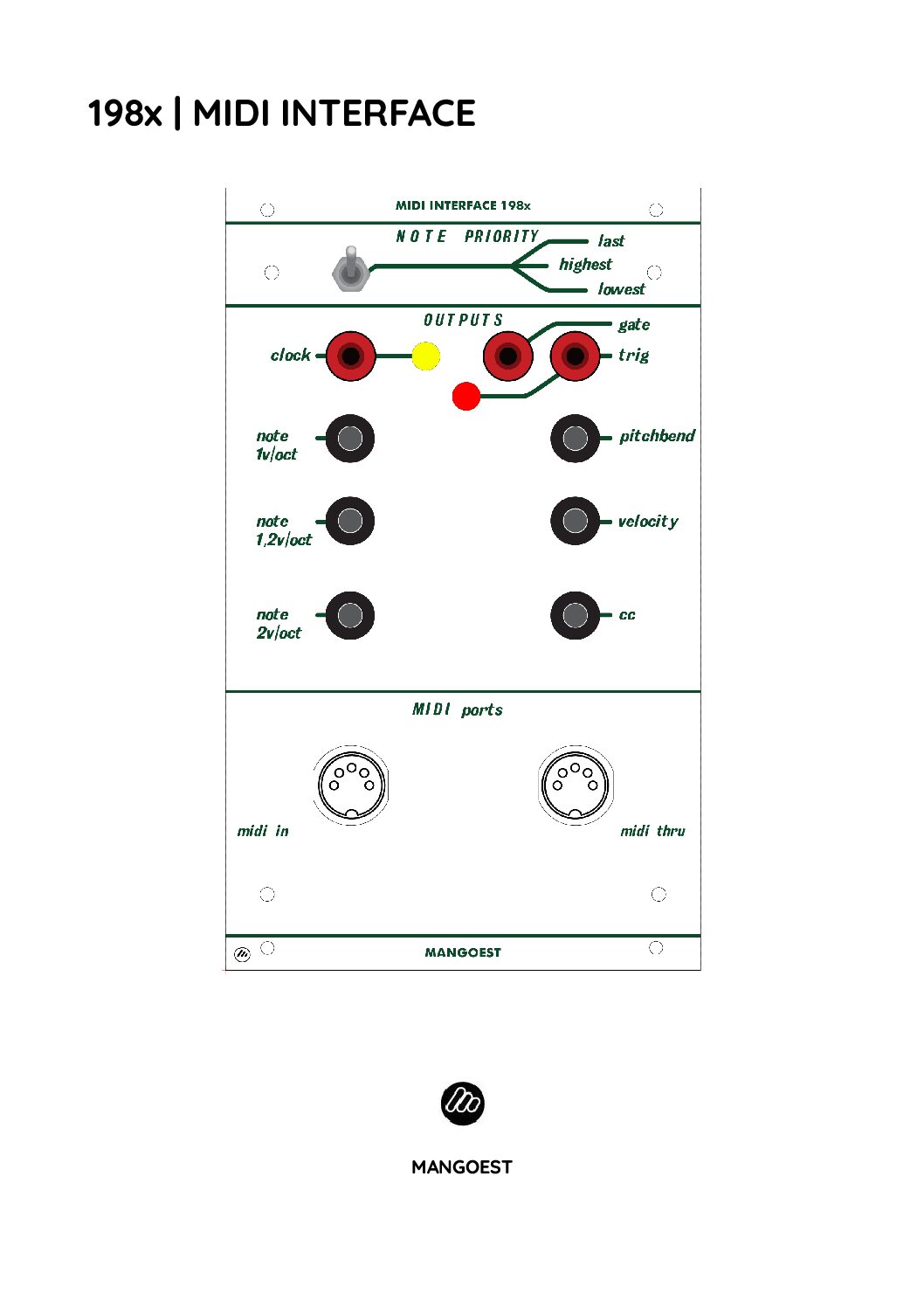 The 198x MIDI Interface by MANGOEST is a precision MIDI-to-CV converter designed to bridge the gap between modern MIDI controllers/sequencers and vintage or modern Buchla-format modular systems.