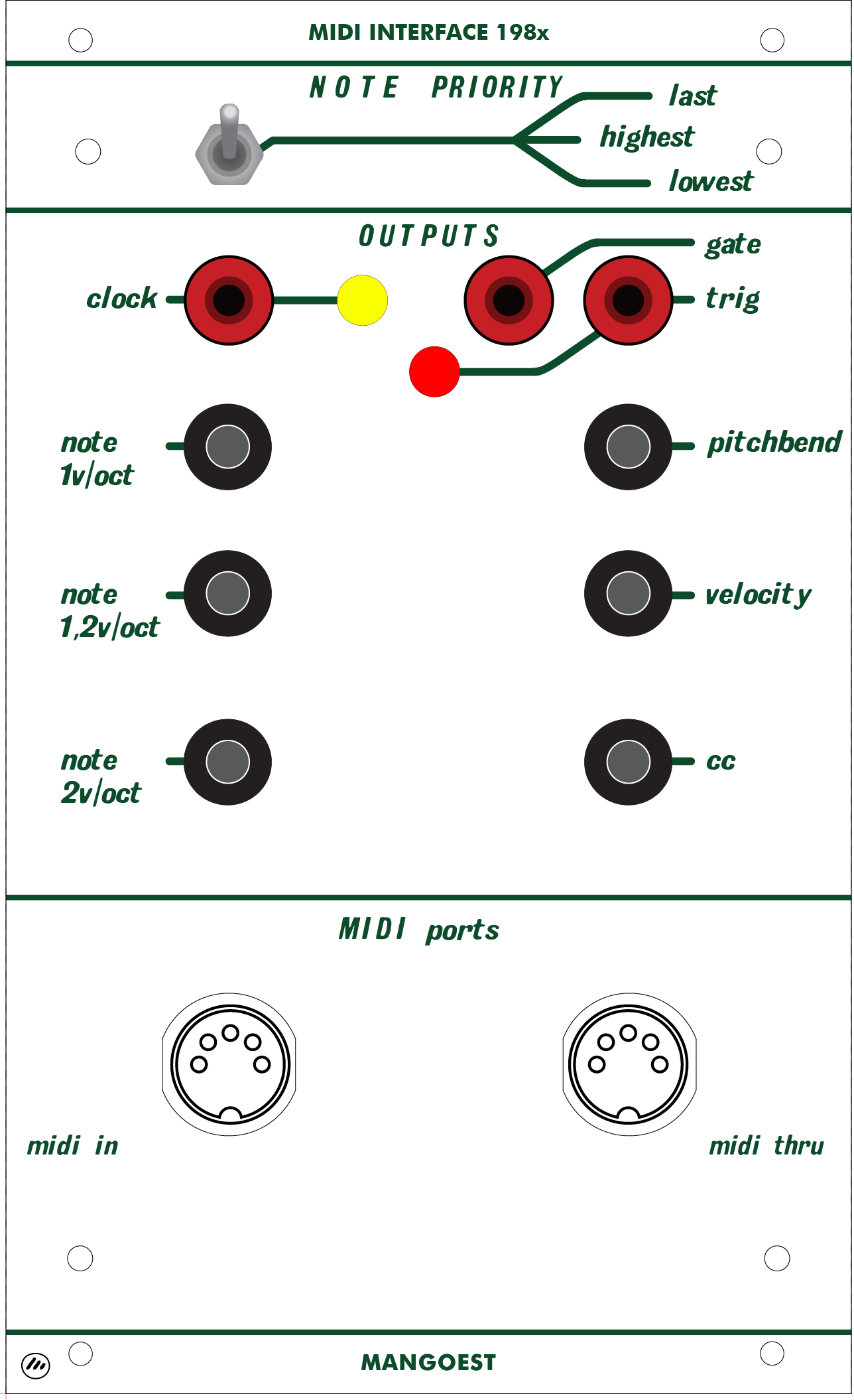 • Clock: Outputs a 10V, 20ms pulse for every quarter note received via MIDI clock. The adjacent yellow LED provides visual tempo feedback.